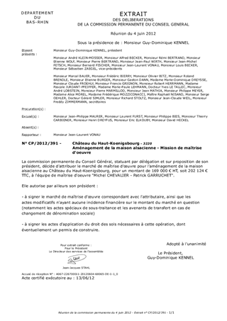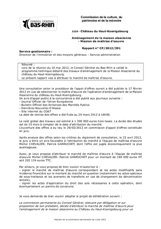 Lors de la réunion du 10 mai 2012, le Conseil Général du Bas-Rhin a validé le programme technique détaillé des travaux d'aménagement de la Maison Alsacienne du château du Haut-Koenigsbourg. Le présent rapport vise à attribuer le marché de maîtrise d'oeuvre.