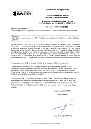 Le présent rapport vise à modifier l'intitulé d'une subvention attribuée au titre de l'eau potable.