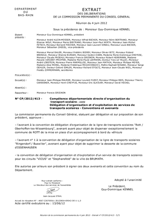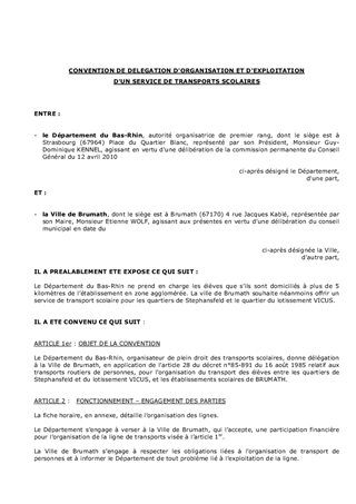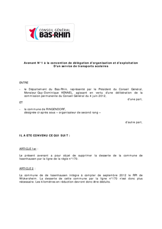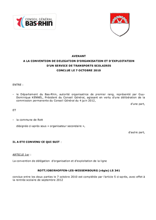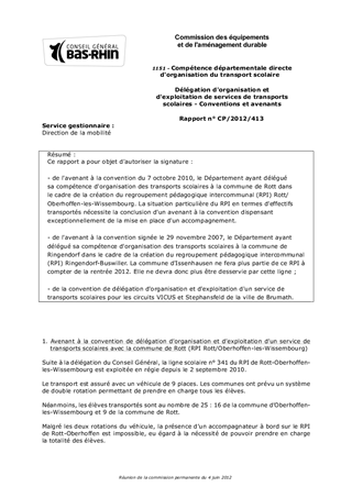 Ce rapport a pour objet d'autoriser la signature : - de l'avenant à la convention du 7 octobre 2010, le Département ayant délégué sa compétence d'organisation des transports scolaires à la commune de Rott dans le cadre de la création du regroupement pédagogique intercommunal (RPI) Rott/Oberhoffen-les-Wissembourg. La situation particulière du RPI en termes d'effectifs transportés nécessite la conclusion d'un avenant à la convention dispensant exceptionnellement de la mise en place d'un accompagnement. - de l'avenant à la convention signée le 29 novembre 2007, le Département ayant délégué sa compétence d'organisation des transports scolaires à la commune de Ringendorf dans le cadre de la création du regroupement pédagogique intercommunal (RPI) Ringendorf-Buswiller. La commune d'Issenhausen ne fera plus partie de ce RPI à compter de la rentrée 2012. Elle ne devra donc plus être desservie par cette ligne ; - de la convention de délégation d'organisation et d'exploitation d'un service de transports scolaires pour les circuits VICUS et Stephansfeld de la ville de Brumath.