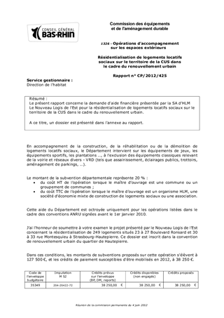 Le présent rapport concerne la demande d'aide financière présentée par la SA d'HLM Le Nouveau Logis de l'Est pour la résidentialisation de logements locatifs sociaux sur le territoire de la CUS dans le cadre du renouvellement urbain. A ce titre, un dossier est présenté dans l'annexe au rapport.
