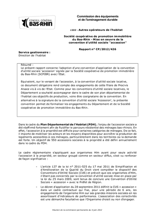 Le présent rapport concerne l'adoption d'une convention d'application de la convention d'utilité sociale 'accession' signée par la Société coopérative de promotion immobilière du Bas-Rhin (SCPIBR) avec l'Etat. Equivalent, sur le versant de l'accession, à la convention d'utilité sociale locative, ce document obligatoire rend compte des engagements de cette filiale de Procivis Alsace vis à vis de l'Etat. Comme pour les conventions d'utilité sociale locatives, le Département a souhaité accompagner dans le cadre de son plan départemental de l'habitat ces objectifs de production, voire être cosignataire de la convention. En alternative à la signature de la convention d'utilité sociale 'Accession', la présente convention permet de formaliser les engagements du Département et de la Société coopérative de promotion immobilière du Bas-Rhin.