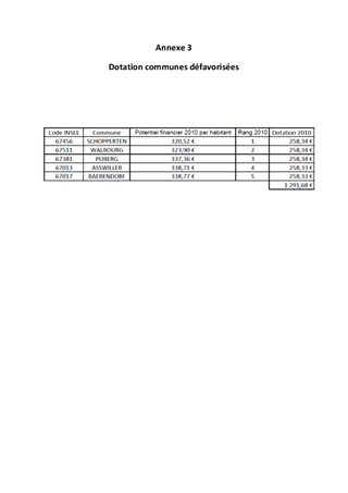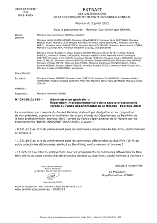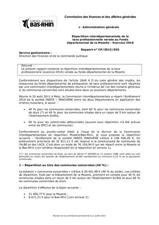 Répartition interdépartementale de la taxe professionnelle versée au Fonds départemental de la Moselle - Exercice 2010 Resumé Le présent rapport concerne la répartition interdépartementale de la taxe professionnelle (exercice 2010) versée au fonds départemental de la Moselle. Pièces jointes Délibération Rapport Annexe 1 Annexe 2 Annexe 3 Annexe 4 Assemblée : Commission Permanente Date : 02/07/2012 Rapporteur : Monsieur Bernard FISCHER Collectivité : Conseil départemental du Bas-Rhin Direction : Pôle fonctionnel Service : Direction des finances et de la commande publique Domaine : Non renseigné Commission : M - Commission des finances et des affaires générales