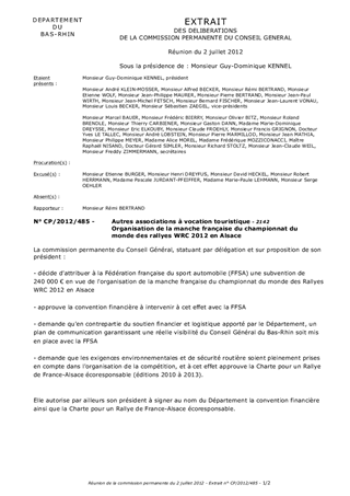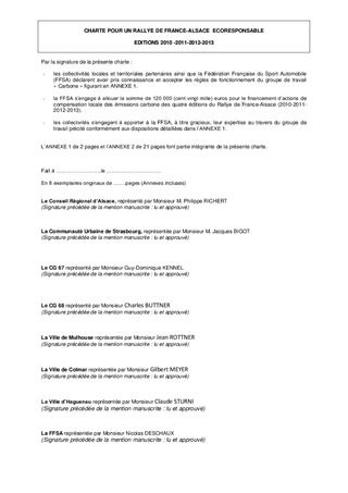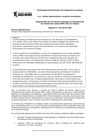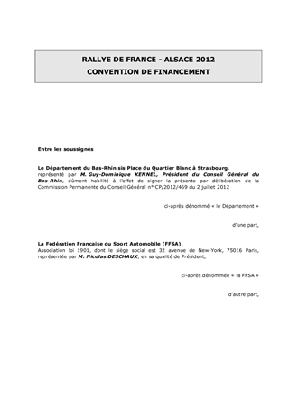 La 2ème édition du Rallye de France Alsace qui s'est déroulée du 30 septembre au 2 octobre 2011 a fait l'objet d'un soutien concerté et exigeant des collectivités alsaciennes afin d'accueillir dans des conditions optimales cette compétition automobile, notamment au plan environnemental, et en valoriser les retombées économiques et en termes d'image. Le bilan positif de la manifestation, au plan de l'organisation et du succès populaire, incite la FFSA à envisager d'ancrer durablement le Rallye de France en Alsace avec le soutien des collectivités pour en faire une compétition phare du championnat du monde des rallyes. Un partenariat a d'ores et déjà été acté pour 2012 et 2013, conforté par les retombées médiatiques et économiques, plus de 18 M€, générées par le rallye. Les contributions des collectivités seront identiques à celles de 2011. Ainsi, pour un budget global de 3 985 000 €, les collectivités alsaciennes contribueront ensemble à hauteur de 1 420 000€, dont une subvention de 240 000 € accordée par le Département du Bas-Rhin, qui prendra en outre en charge les mesures d'exploitation et de sécurité routière sur le réseau départemental. Par ailleurs, conformément aux engagements pris, la charte pour un Rallye de France-Alsace écoresponsable est mise en place (financement d'actions de compensation locale des émissions de carbone des quatre éditions de l'épreuve automobile 2010 à 2013).