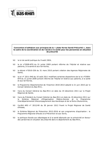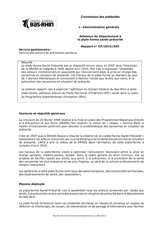 La plate-forme Santé-Précarité est un dispositif mis en place en 2007 sous l'impulsion de la DRASS et intégrée à l'ARS depuis avril 2010. Elle vise à regrouper l'ensemble des acteurs institutionnels et associatifs qui interviennent dans la prise en charge des personnes en situation de précarité. Les travaux de la plate-forme se réalisent au sein de 7 ateliers thématiques et concourent à faciliter l'accès aux droits, aux soins, à la prévention des personnes en situation de précarité. Le présent rapport vise à examiner l'adhésion du Conseil Général du Bas-Rhin à cette plate-forme, adhésion prévue au Pacte Territorial d'Insertion (PTI) validé dans le cadre du Programme Départemental d'Insertion (PDI).