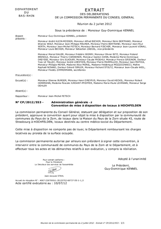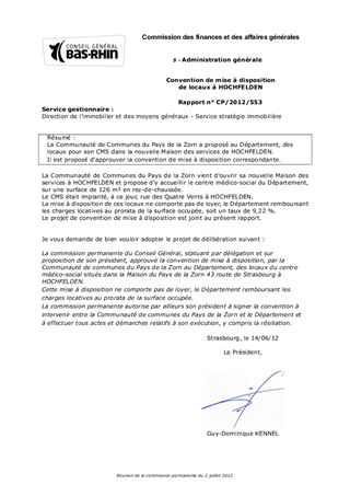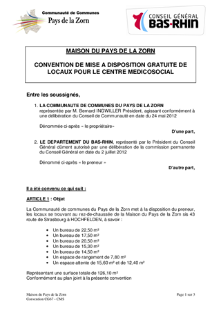 La Communauté de Communes du Pays de la Zorn a proposé au Département, des locaux pour son CMS dans la nouvelle Maison des services de HOCHFELDEN. Il est proposé d'approuver la convention de mise à disposition correspondante.