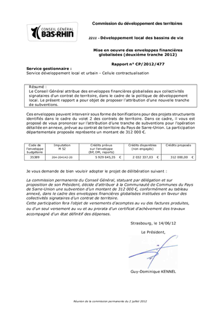 Le Conseil Général attribue des enveloppes financières globalisées aux collectivités signataires d'un contrat de territoire, dans le cadre de la politique de développement local. Le présent rapport a pour objet de proposer l'attribution d'une nouvelle tranche de subventions.