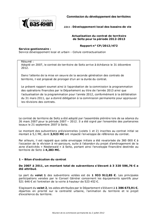 Adopté en 2007, le contrat de territoire de Seltz arrive à échéance le 31 décembre 2012. Dans l'attente de la mise en oeuvre de la seconde génération des contrats de territoire, il est proposé de proroger d'un an la durée du contrat. Le présent rapport soumet ainsi à l'approbation de la commission la programmation des opérations financées par le Département au titre de l'année 2013 ainsi que l'actualisation de la programmation pour l'année 2012, conformément à la délibération du 31 mars 2011, qui a donné délégation à la commission permanente pour approuver les révisions des contrats.