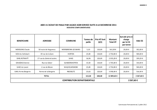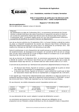 Par délibération en date du 5 décembre 2011, la commission permanente du Conseil Général a décidé d'attribuer des aides financières à l'acquisition de paille en direct ou par le biais de l'association Alsace Agri Service pour les éleveurs bas-rhinois suite à la sécheresse 2011. Le présent rapport porte sur une liste complémentaire d'éleveurs susceptibles de bénéficier du soutien financier du Département.