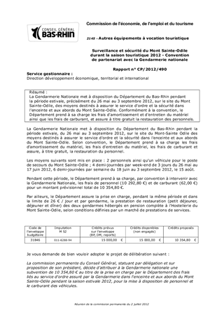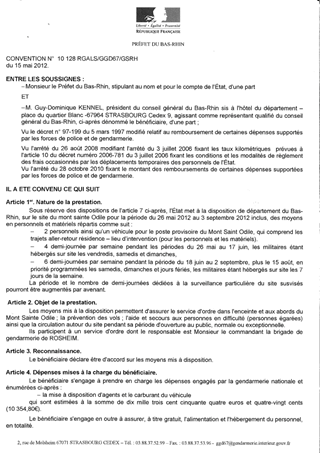 La Gendarmerie Nationale met à disposition du Département du Bas-Rhin pendant la période estivale, précisément du 26 mai au 3 septembre 2012, sur le site du Mont Sainte-Odile, des moyens destinés à assurer le service d'ordre et la sécurité dans l'enceinte et aux abords du Mont Sainte-Odile. Conformément à la convention, le Département prend à sa charge les frais d'amortissement et d'entretien du matériel ainsi que les frais de carburant, et assure à titre gratuit la restauration des personnels.