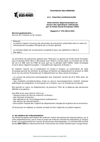 Le présent rapport concerne des demandes de subvention présentées dans le cadre du cofinancement européen FSE géré par le Conseil général. Le montant global de la subvention européenne pour ces opérations s'élève à 604 688 €.