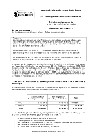 La méthodologie actuelle de suivi financier des contrats de territoires, adoptée par l'assemblée plénière le 26 octobre 2009 prévoit la réalisation de bilans financiers annuels, ainsi qu'une révision à mi-parcours qui comporte notamment l'actualisation de la programmation des volets 1 et 2. Par délibération du 31 mars 2011, l'assemblée plénière a donné délégation à la commission permanente pour approuver les révisions à mi-parcours des contrats. En application de ces décisions, la commission permanente est appelée à valider la révision à mi-parcours du contrat de territoire de Sélestat.