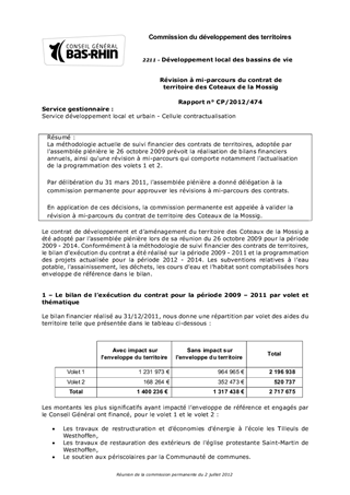 La méthodologie actuelle de suivi financier des contrats de territoires, adoptée par l'assemblée plénière le 26 octobre 2009 prévoit la réalisation de bilans financiers annuels, ainsi qu'une révision à mi-parcours qui comporte notamment l'actualisation de la programmation des volets 1 et 2. Par délibération du 31 mars 2011, l'assemblée plénière a donné délégation à la commission permanente pour approuver les révisions à mi-parcours des contrats. En application de ces décisions, la commission permanente est appelée à valider la révision à mi-parcours du contrat de territoire des Coteaux de la Mossig.