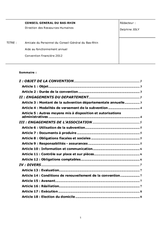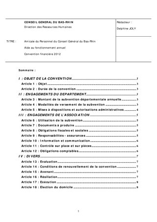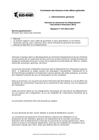 Le présent rapport a pour objet de soumettre à votre approbation la convention financière conclue, pour l'exercice 2012, entre l'Amicale du personnel du Conseil Général du Bas-Rhin et le Département.