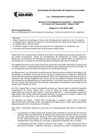 Dans le cadre de sa politique en faveur de l'enseignement supérieur et de l'innovation, le Département a décidé de soutenir le fonctionnement de l'association Alsace Tech sur les années 2011, 2012 et 2013. Le présent rapport a pour objet de confirmer cet engagement en attribuant une subvention de fonctionnement de 10 000 euros à Alsace Tech.