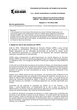 Il est proposé à la Commission Permanente du Conseil Général d'approuver une convention-cadre multi-partenariale relative à l'Observatoire Régional du Tourisme d'Alsace (ORTA), qui vise à instituer une gouvernance partagée de cet outil et un pilotage commun des actions permettant de développer une meilleure connaissance du domaine du tourisme dans notre région, et notamment de ses retombées économiques en Alsace et dans les territoires.