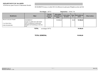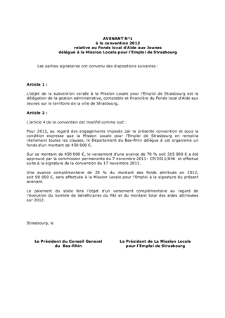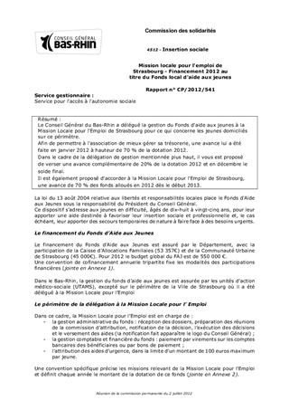 Le Conseil Général du Bas-Rhin a délégué la gestion du Fonds d'aide aux jeunes à la Mission Locale pour l'Emploi de Strasbourg pour ce qui concerne les jeunes domiciliés sur ce périmètre. Afin de permettre à l'association de mieux gérer sa trésorerie, une avance lui a été faite en janvier 2012 à hauteur de 70 % de la dotation 2012. Dans le cadre de la délégation de gestion mentionnée plus haut, il vous est proposé de verser une avance complémentaire de 20% de la dotation 2012 et en décembre le solde final. Il est également proposé d'accorder à la Mission Locale pour l'Emploi de Strasbourg, une avance de 70 % des fonds alloués en 2012 dès le début 2013.