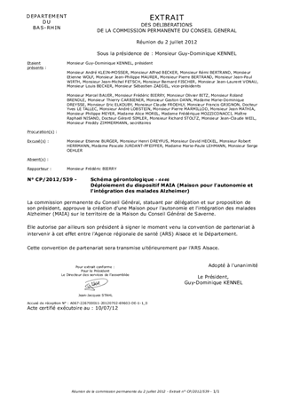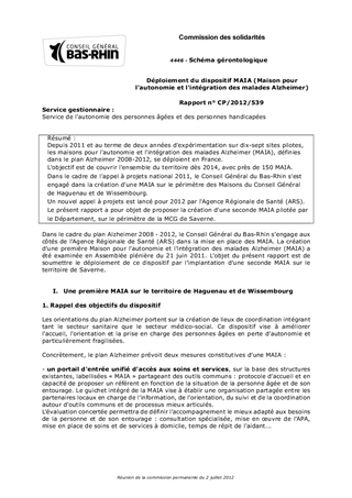 Depuis 2011 et au terme de deux années d'expérimentation sur dix-sept sites pilotes, les maisons pour l'autonomie et l'intégration des malades Alzheimer (MAIA), définies dans le plan Alzheimer 2008-2012, se déploient en France. L'objectif est de couvrir l'ensemble du territoire dès 2014, avec près de 150 MAIA. Dans le cadre de l'appel à projets national 2011, le Conseil Général du Bas-Rhin s'est engagé dans la création d'une MAIA sur le périmètre des Maisons du Conseil Général de Haguenau et de Wissembourg. Un nouvel appel à projets est lancé pour 2012 par l'Agence Régionale de Santé (ARS). Le présent rapport a pour objet de proposer la création d'une seconde MAIA pilotée par le Département, sur le périmètre de la MCG de Saverne.