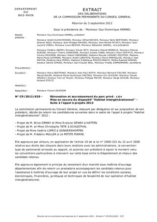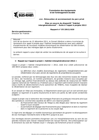 Lors de sa réunion du 12 décembre 2011, le Conseil Général a retenu le principe du lancement d'un appel à projets pour l'habitat intergénérationnel avec pour objectif d'expérimenter de nouveaux modèles économiques de réhabilitation du bâti existant, notamment pour des ménages âgés en perte d'autonomie. Le présent rapport a pour objet de valider les candidatures de cet appel et les suites à donner.