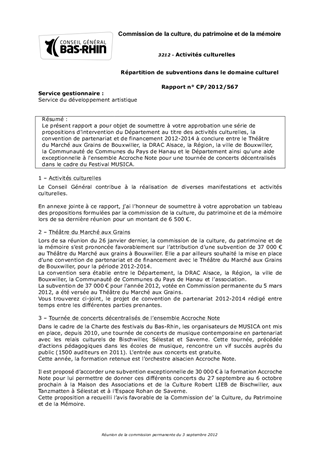 Le présent rapport a pour objet de soumettre à votre approbation une série de propositions d'intervention du Département au titre des activités culturelles, la convention de partenariat et de financement 2012-2014 à conclure entre le Théâtre du Marché aux Grains de Bouxwiller, la DRAC Alsace, la Région, la ville de Bouxwiller, la Communauté de Communes du Pays de Hanau et le Département ainsi qu'une aide exceptionnelle à l'ensemble Accroche Note pour une tournée de concerts décentralisés dans le cadre du Festival MUSICA.