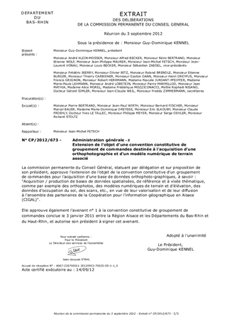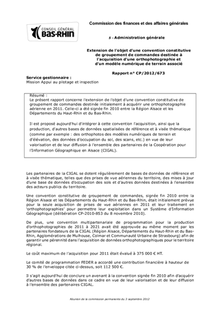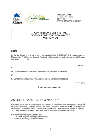 Le présent rapport concerne l'extension de l'objet d'une convention constitutive de groupement de commandes destinée initialement à acquérir une orthophotographie aérienne en 2011. Celle-ci a été signée fin 2010 entre la Région Alsace et les Départements du Haut-Rhin et du Bas-Rhin. Il est proposé aujourd'hui d'intégrer à cette convention l'acquisition, ainsi que la production, d'autres bases de données spatialisées de référence et à visée thématique (comme par exemple : des orthophotos des modèles numériques de terrain et d'élévation, des données d'occupation du sol, des scans, etc.) en vue de leur valorisation et de leur diffusion à l'ensemble des partenaires de la Coopération pour l'Information Géographique en Alsace (CIGAL).