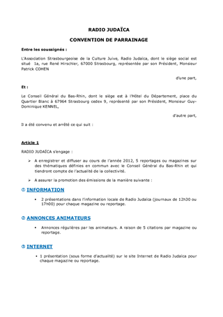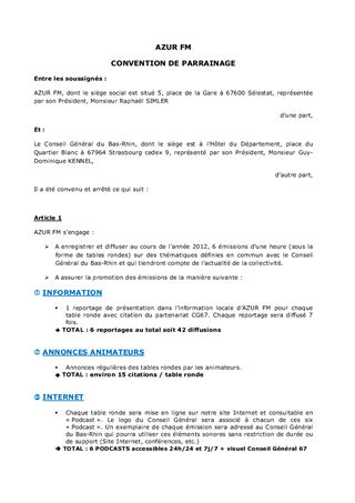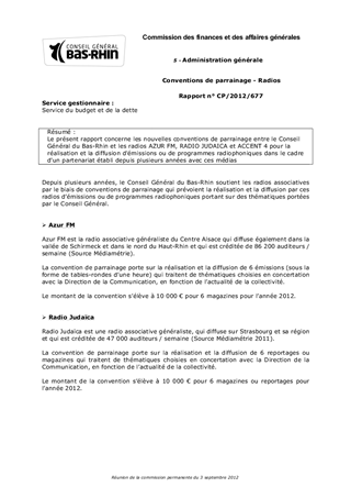 Le présent rapport concerne les nouvelles conventions de parrainage entre le Conseil Général du Bas-Rhin et les radios AZUR FM, RADIO JUDAICA et ACCENT 4 pour la réalisation et la diffusion d'émissions ou de programmes radiophoniques dans le cadre d'un partenariat établi depuis plusieurs années avec ces médias