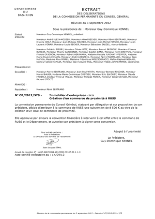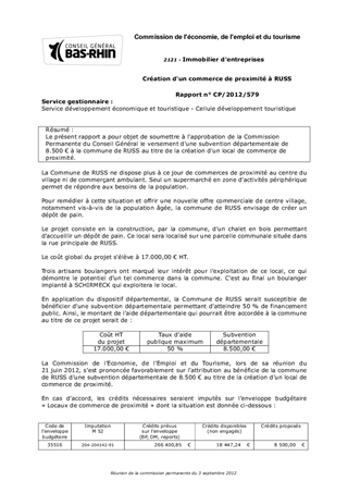 Le présent rapport a pour objet de soumettre à l'approbation de la Commission Permanente du Conseil Général le versement d'une subvention départementale de 8.500 € à la commune de RUSS au titre de la création d'un local de commerce de proximité.