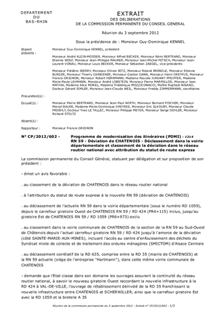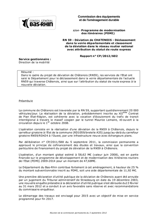 Dans le cadre du projet de déviation de Châtenois (RN59), les services de l'Etat ont saisi le Département pour le déclassement dans la voirie départementale de l'actuelle RN59 qui traverse Châtenois, ainsi que sur l'attribution du statut de route express à la nouvelle déviation.