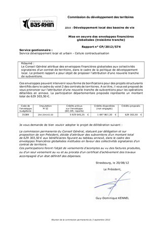 Le Conseil Général attribue des enveloppes financières globalisées aux collectivités signataires d'un contrat de territoire, dans le cadre de la politique de développement local. Le présent rapport a pour objet de proposer l'attribution d'une nouvelle tranche de subventions.