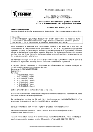 Le présent rapport a pour objet de soumettre à votre approbation les modalités d'une acquisition de parcelles nécessaire au projet d'aménagement d'un carrefour giratoire sur la RD 421 sur le territoire de la commune de SCHWINDRATZHEIM.