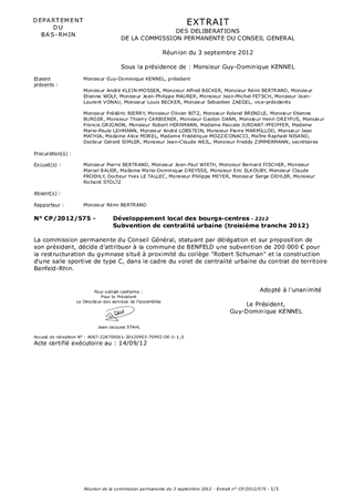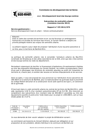 Dans le cadre des contrats de territoire et en vue de favoriser un aménagement harmonieux et durable du territoire bas-rhinois, le Conseil Général a adopté une priorité partagée relative aux enjeux de centralité urbaine. Le présent rapport a pour objet de proposer l'attribution d'une nouvelle subvention à ce titre, pour le territoire de Benfeld-Rhin.