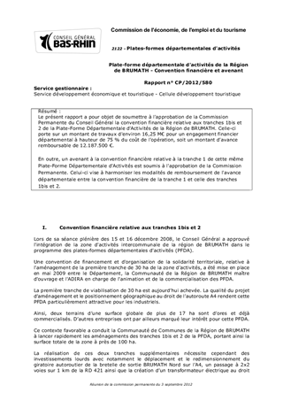 Le présent rapport a pour objet de soumettre à l'approbation de la Commission Permanente du Conseil Général la convention financière relative aux tranches 1bis et 2 de la Plate-Forme Départementale d'Activités de la Région de BRUMATH. Celle-ci porte sur un montant de travaux d'environ 16,25 M€ pour un engagement financier départemental à hauteur de 75 % du coût de l'opération, soit un montant d'avance remboursable de 12.187.500 €. En outre, un avenant à la convention financière relative à la tranche 1 de cette même Plate-Forme Départementale d'Activités est soumis à l'approbation de la Commission Permanente. Celui-ci vise à harmoniser les modalités de remboursement de l'avance départementale entre la convention financière de la tranche 1 et celle des tranches 1bis et 2.