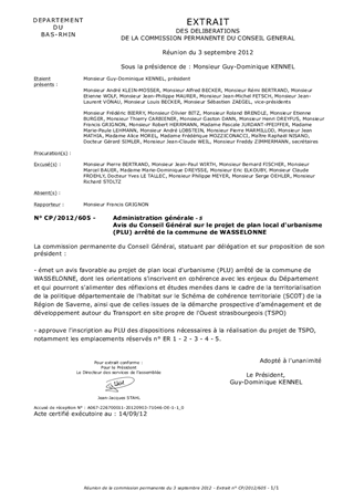 Le Département suit l'élaboration de l'ensemble des Plans Locaux d'Urbanisme sur le territoire bas-rhinois, au titre de sa mission de « Personne publique associée » aux documents d'urbanisme. La commune de Wasselonne finalise actuellement son projet et arrive en phase de PLU « arrêté ». Conformément à l'article L123-9 du Code de l'Urbanisme, ces documents sont transmis au Département, pour qu'il fasse connaître son avis, en tant que personne publique associée.