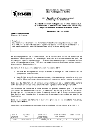 Le présent rapport concerne les demandes d'aides financières présentées par CUS HABITAT pour la résidentialisation de logements locatifs sociaux sur le territoire de la CUS dans le cadre du renouvellement urbain du quartier de Hautepierre.