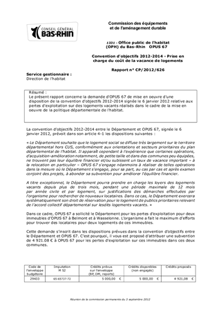 Le présent rapport concerne la demande d'OPUS 67 de mise en oeuvre d'une disposition de la convention d'objectifs 2012-2014 signée le 6 janvier 2012 relative aux pertes d'exploitation sur des logements vacants réalisés dans le cadre de la mise en oeuvre de la politique départementale de l'habitat.