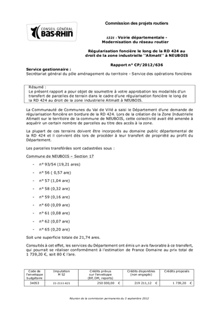 Le présent rapport a pour objet de soumettre à votre approbation les modalités d'un transfert de parcelles de terrain dans le cadre d'une régularisation foncière le long de la RD 424 au droit de la zone industrielle Altmatt à NEUBOIS.