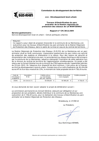 Ce rapport a pour objet de proposer d'accorder à la commune de La Wantzenau une subvention pour les travaux d'électrification du parc animalier de la Station Régionale de Protection des Oiseaux, dans le cadre de la mise en oeuvre du contrat de territoire.