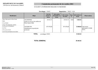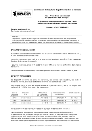 Le présent rapport a pour objet de soumettre à votre approbation les propositions d'attribution de subventions aux communes, groupements de communes, paroisses et associations pour les travaux en faveur du patrimoine religieux et du petit patrimoine.