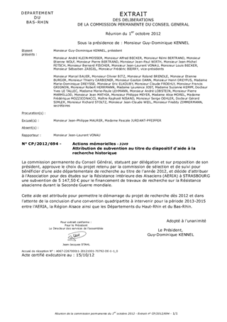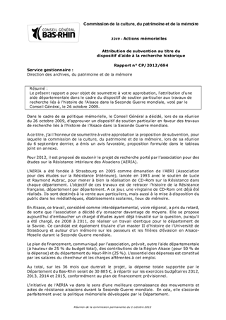 Le présent rapport a pour objet de soumettre à votre approbation, l'attribution d'une aide départementale dans le cadre du dispositif de soutien particulier aux travaux de recherche liés à l'histoire de l'Alsace dans la Seconde Guerre mondiale, voté par le Conseil Général, le 26 octobre 2009.
