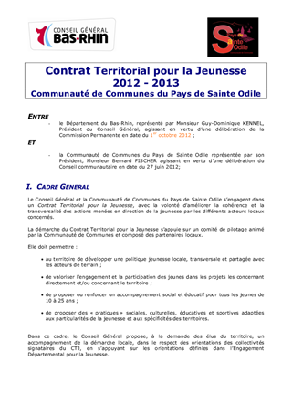 Le présent rapport soumet à votre approbation : - les contrats territoriaux pour la jeunesse des Communautés de communes du Pays de Sainte Odile et des Coteaux de la Mossig, - le plan d'actions 2012 du Contrat Territorial pour la Jeunesse de la commune de Schiltigheim, - le concours financier apporté par le Département aux associations pour leurs actions en faveur des jeunes, avec une mention particulière pour le projet 'Pass'Engagement' porté par le centre socioculturel Robert Schuman de Haguenau, - le soutien au Comité départemental d'athlétisme pour l'opération 'Pass'Forme' dans les collèges bas-rhinois volontaires.