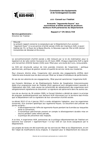 Le présent rapport concerne la cosignature par le Département d'un avenant ''logement foyer'' à la convention d'utilité sociale (CUS) de 4 bailleurs HLM, à savoir Habitat de l'Ill, le Foyer de la Basse-Bruche, le Nouveau Logis de l'Est et AIS (Action Immobilière de Sélestat et Environs).