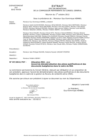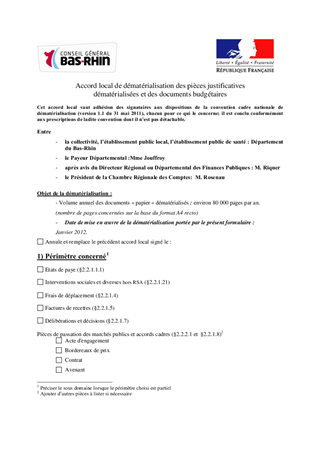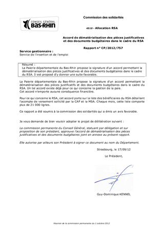 La Paierie départementale du Bas-Rhin propose la signature d'un accord permettant la dématérialisation des pièces justificatives et des documents budgétaires dans le cadre du RSA. Il est proposé d'y donner une suite favorable.