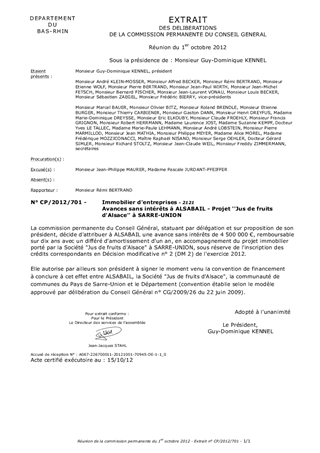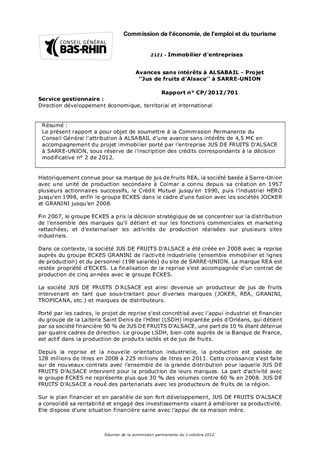 Le présent rapport a pour objet de soumettre à la Commission Permanente du Conseil Général l'attribution à ALSABAIL d'une avance sans intérêts de 4,5 M€ en accompagnement du projet immobilier porté par l'entreprise JUS DE FRUITS D'ALSACE à SARRE-UNION, sous réserve de l'inscription des crédits correspondants à la décision modificative n° 2 de 2012.