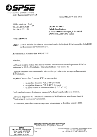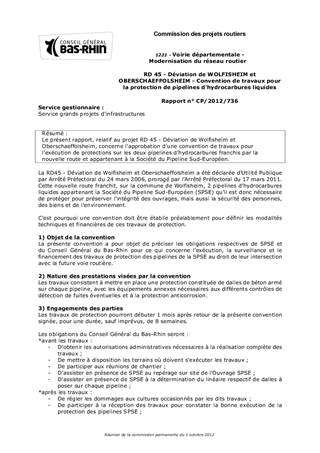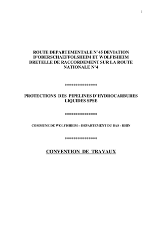 Le présent rapport, relatif au projet RD 45 - Déviation de Wolfisheim et Oberschaeffolsheim, concerne l'approbation d'une convention de travaux pour l'exécution de protections sur les deux pipelines d'hydrocarbures franchis par la nouvelle route et appartenant à la Société du Pipeline Sud-Européen.