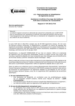 Le présent rapport concerne la demande de subvention présentée par le CEP-CICAT pour la reconduction de l'assistance à maîtrise d'ouvrage des bailleurs HLM et pour l'accompagnement des bailleurs HLM dans la réalisation de l'adaptation des logements aux besoins de leurs locataires.