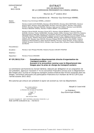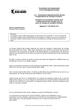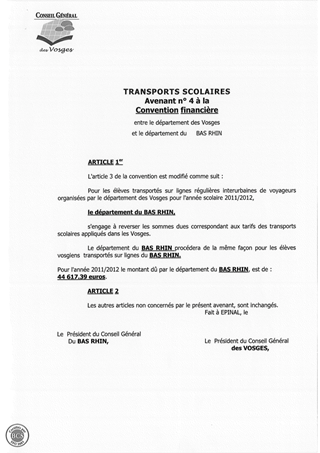 Ce rapport a pour objet de proposer la conclusion d'un avenant n° 4 à la convention financière signée avec le Département des Vosges et relative à la prise en charge du transport scolaire d'élèves bas-rhinois et scolarisés au collège de Provenchères-sur-Fave.