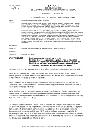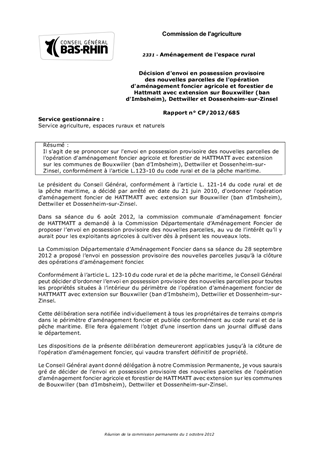 Il s'agit de se prononcer sur l'envoi en possession provisoire des nouvelles parcelles de l'opération d'aménagement foncier agricole et forestier de HATTMATT avec extension sur les communes de Bouxwiller (ban d'Imbsheim), Dettwiller et Dossenheim-sur-Zinsel, conformément à l'article L.123-10 du code rural et de la pêche maritime.