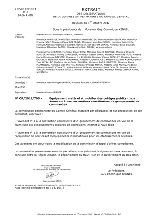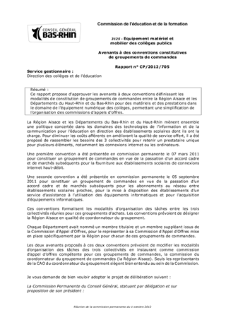 Ce rapport propose d'approuver les avenants à deux conventions définissant les modalités de constitution de groupements de commandes entre la Région Alsace et les Départements du Haut-Rhin et du Bas-Rhin pour des matériels et des prestations dans le domaine de l'équipement numérique des collèges, permettant une simplification de l'organisation des commissions d'appels d'offres.