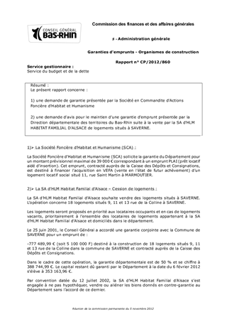 Le présent rapport concerne : 1) une demande de garantie présentée par la Société en Commandite d'Actions Foncière d'Habitat et Humanisme 2) une demande d'avis pour le maintien d'une garantie d'emprunt présentée par la Direction départementale des territoires du Bas-Rhin suite à la vente par la SA d'HLM HABITAT FAMILIAL D'ALSACE de logements situés à SAVERNE.