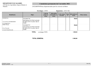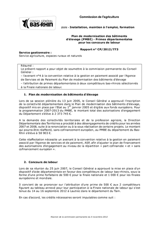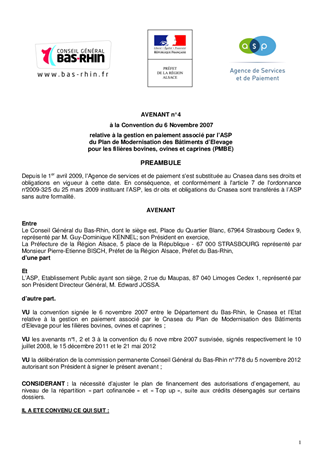 Le présent rapport a pour objet de soumettre à la commission permanente du Conseil Général : - l'avenant n°4 à la convention relative à la gestion en paiement associé par l'Agence de Services et de Paiement du Plan de modernisation des bâtiments d'élevage - l'attribution de primes départementales à deux compétiteurs bas-rhinois sélectionnés à la Finale nationale de labour.