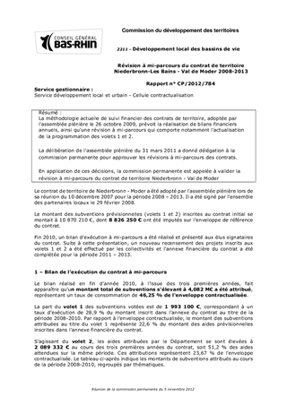 La méthodologie actuelle de suivi financier des contrats de territoire, adoptée par l'assemblée plénière le 26 octobre 2009, prévoit la réalisation de bilans financiers annuels, ainsi qu'une révision à mi-parcours qui comporte notamment l'actualisation de la programmation des volets 1 et 2. La délibération de l'assemblée plénière du 31 mars 2011 a donné délégation à la commission permanente pour approuver les révisions à mi-parcours des contrats. En application de ces décisions, la commission permanente est appelée à valider la révision à mi-parcours du contrat de territoire Niederbronn - Val de Moder
